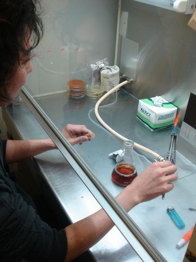 余計な菌が入らないようにバーナーで熱した金属の棒で作業する。