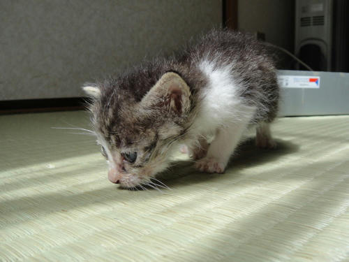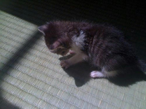 ファズはもう最初っから手のかからない子で、トイレは自分で覚えるし、エサはなんでもよく食べるし、という感じでしたが、エコーはそうはいきません。なんせ生後二週間。3時間おきぐらいにエサを欲しがってニーニー!と鳴きます。結構大変。仕事の合間にちょくちょく様子を見に行きます。