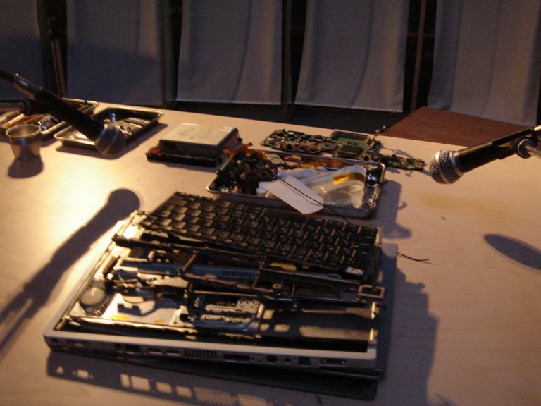 机の上にPBを置き、その解体の音を二本のマイクで拾う。これは曲の進行とは関係なくずっと聞こえてくる。