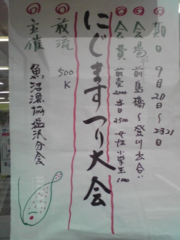 縦の赤い線が「大会」にかかってる感じとか、期日が最初2日も間違って書いてしまったことも格調高いですが、何と言っても左下の魚?がイイ感じです。
